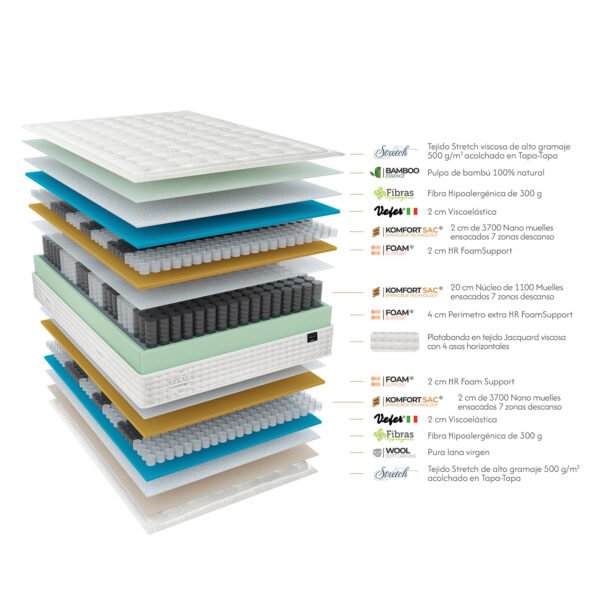 En su interior cuenta con 3704 nano-muelles de 2 cm, una carcasa de muelles ensacados de 20 cm con 3704 muelles, y perímetro reforzado que ofrece una independencia de lechos óptima para el durmiente.