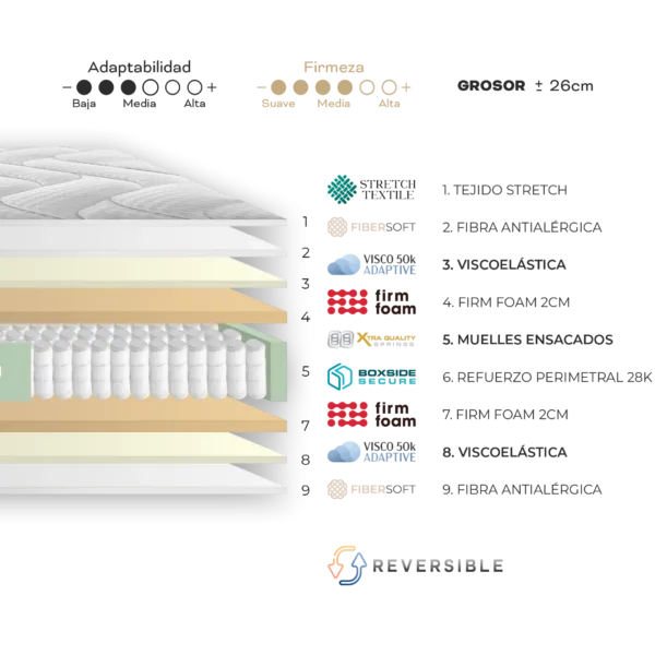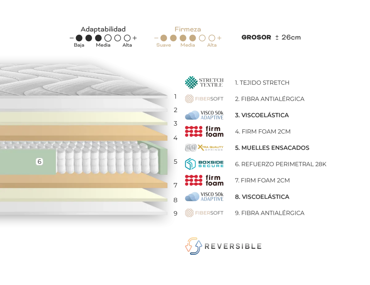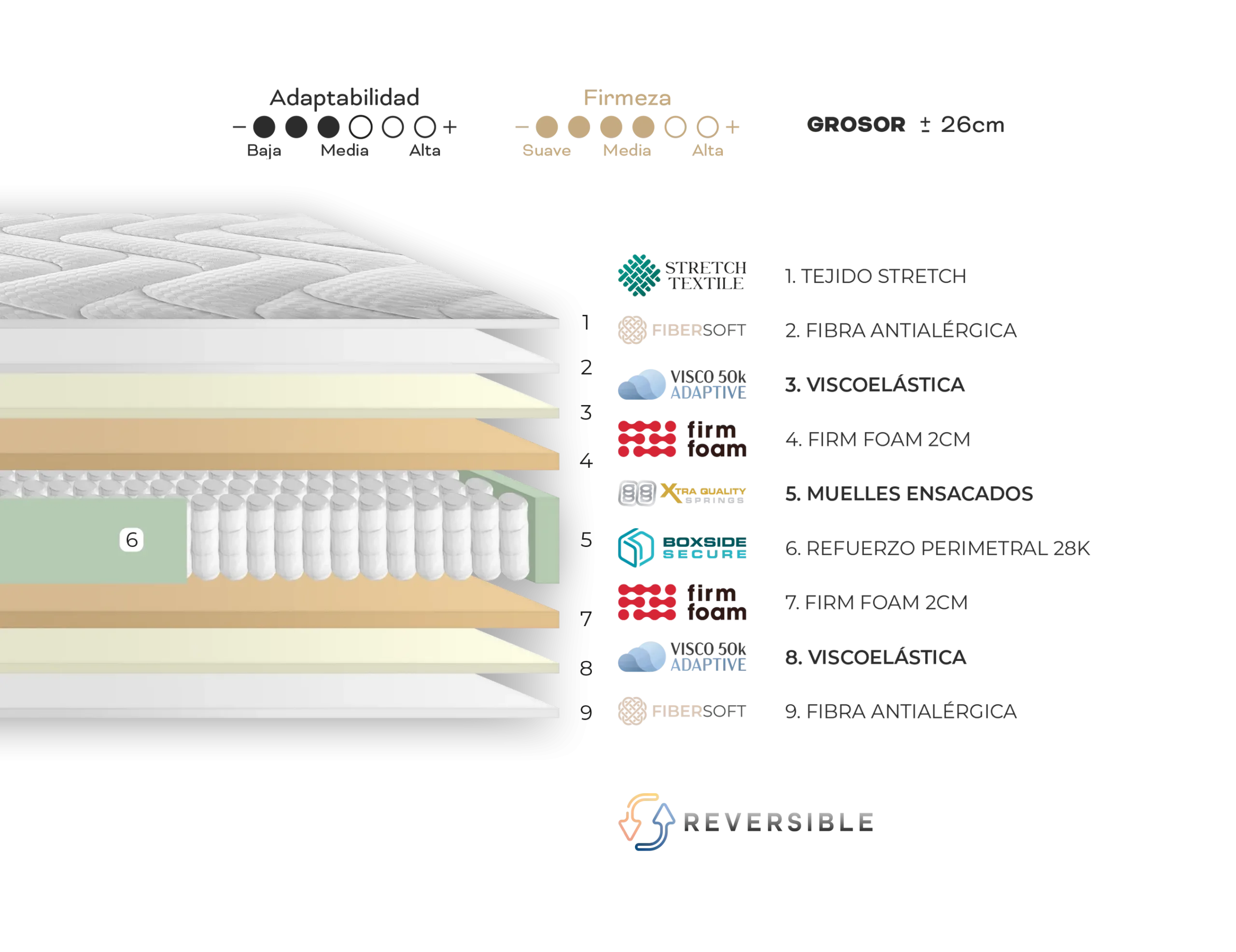 Dispone de doble cara con composición simétrica, incluyendo capas de viscoelástica, Firm Foam de 2 cm y fibra antialérgica en ambas superficies. Estas capas mejoran la acogida sin perder firmeza, aliviando puntos de presión y ofreciendo una sensación confortable en cada posición.