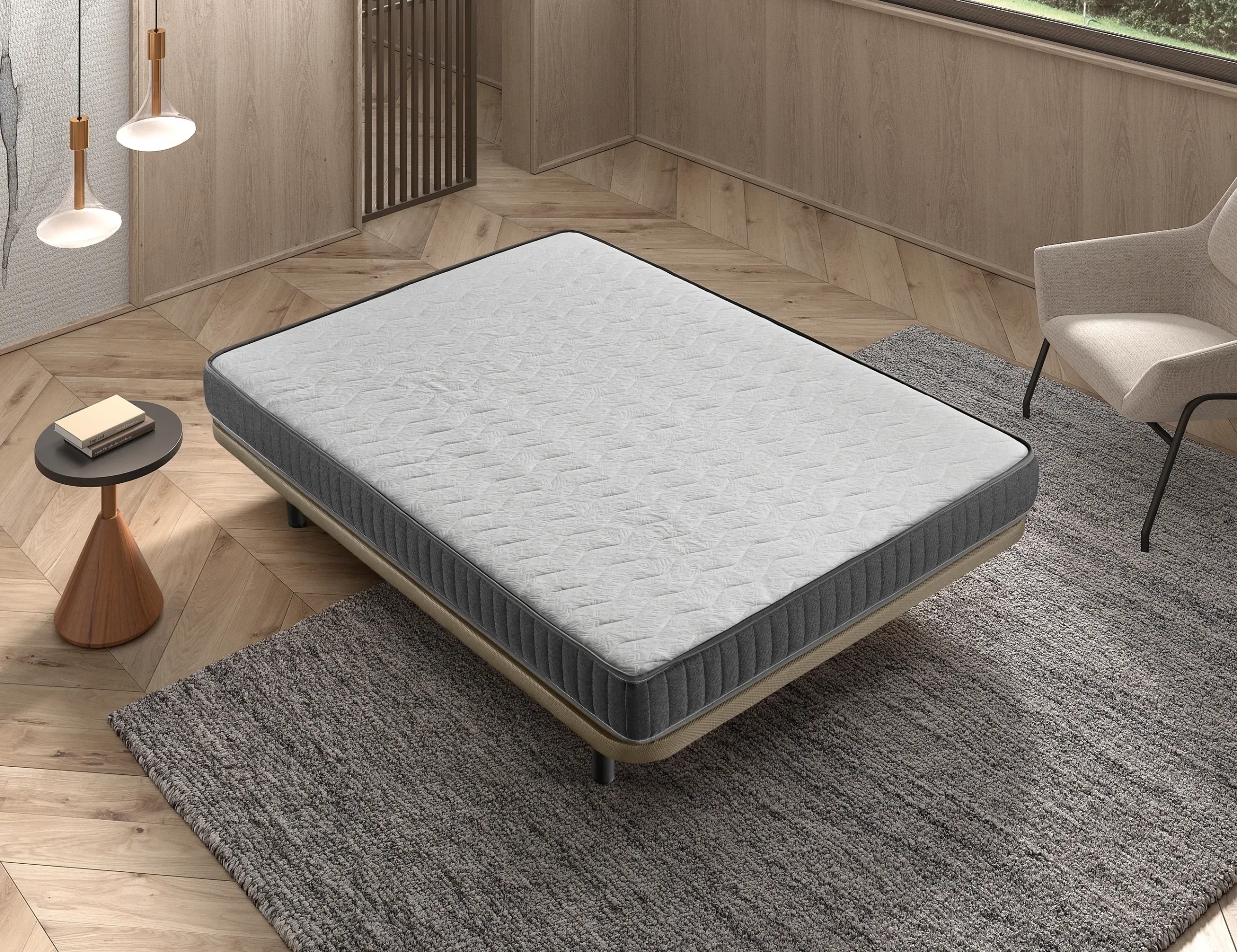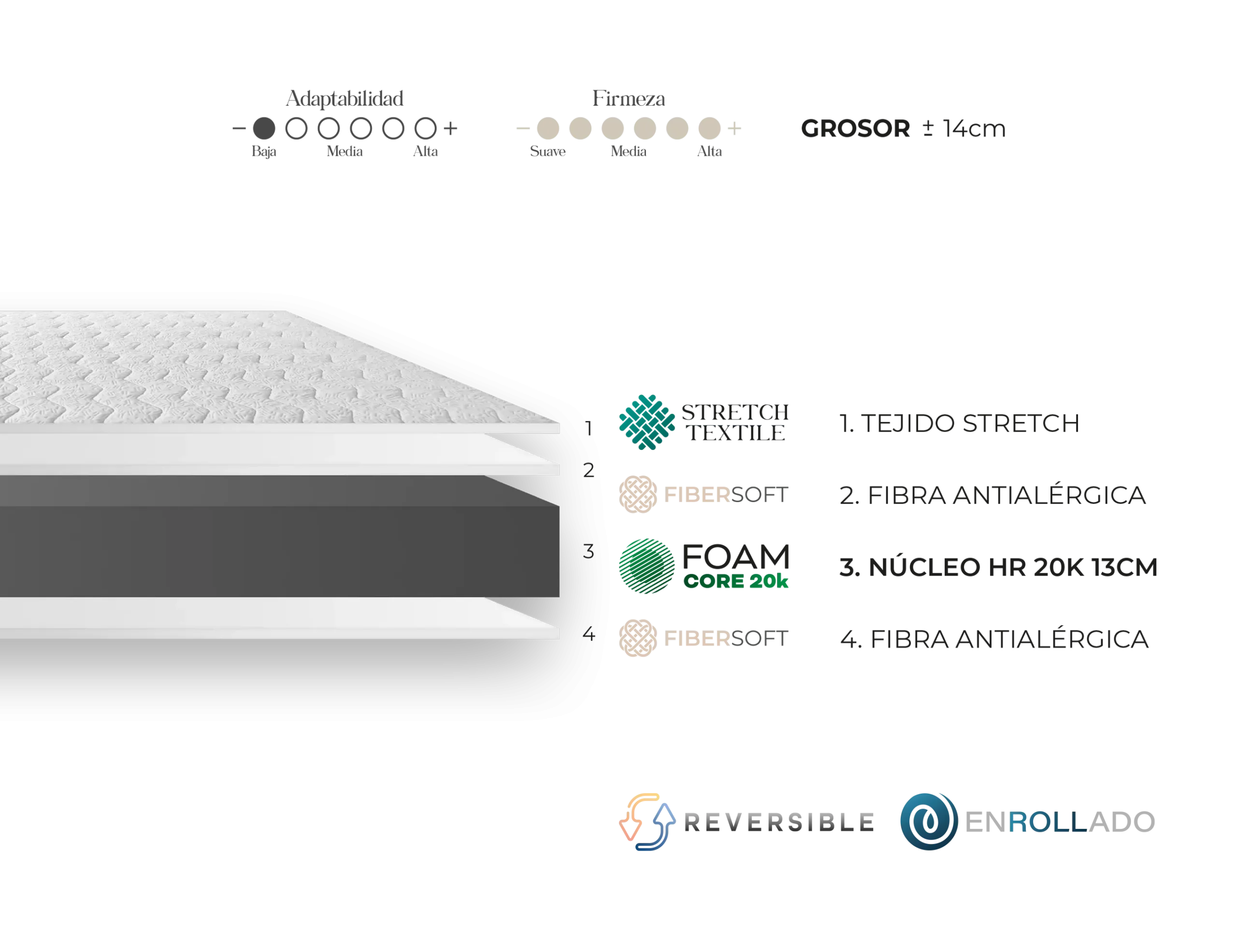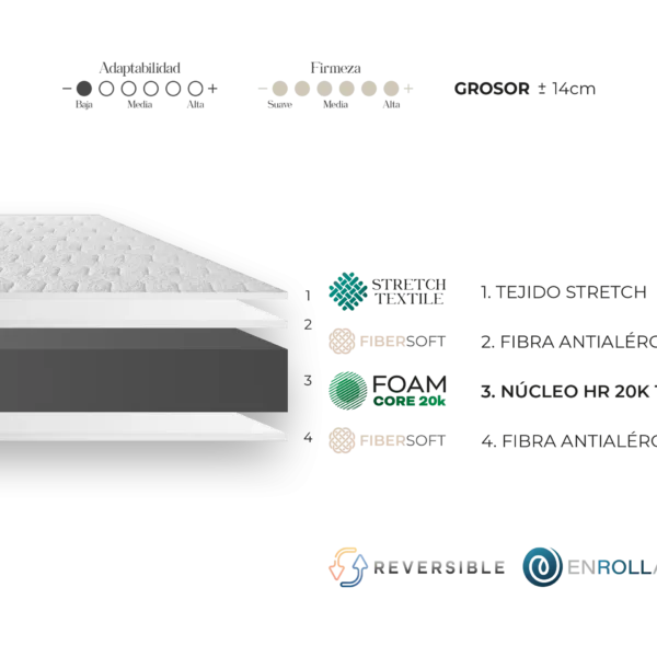 La colchoneta Eco 14 es una alternativa sencilla y funcional, con un núcleo de HR de 20k que proporciona un soporte adecuado para distintas necesidades. Es reversible, permitiendo el uso por ambas caras y extendiendo su vida útil. La colchoneta se entrega enrollada para un manejo y transporte más práctico.
