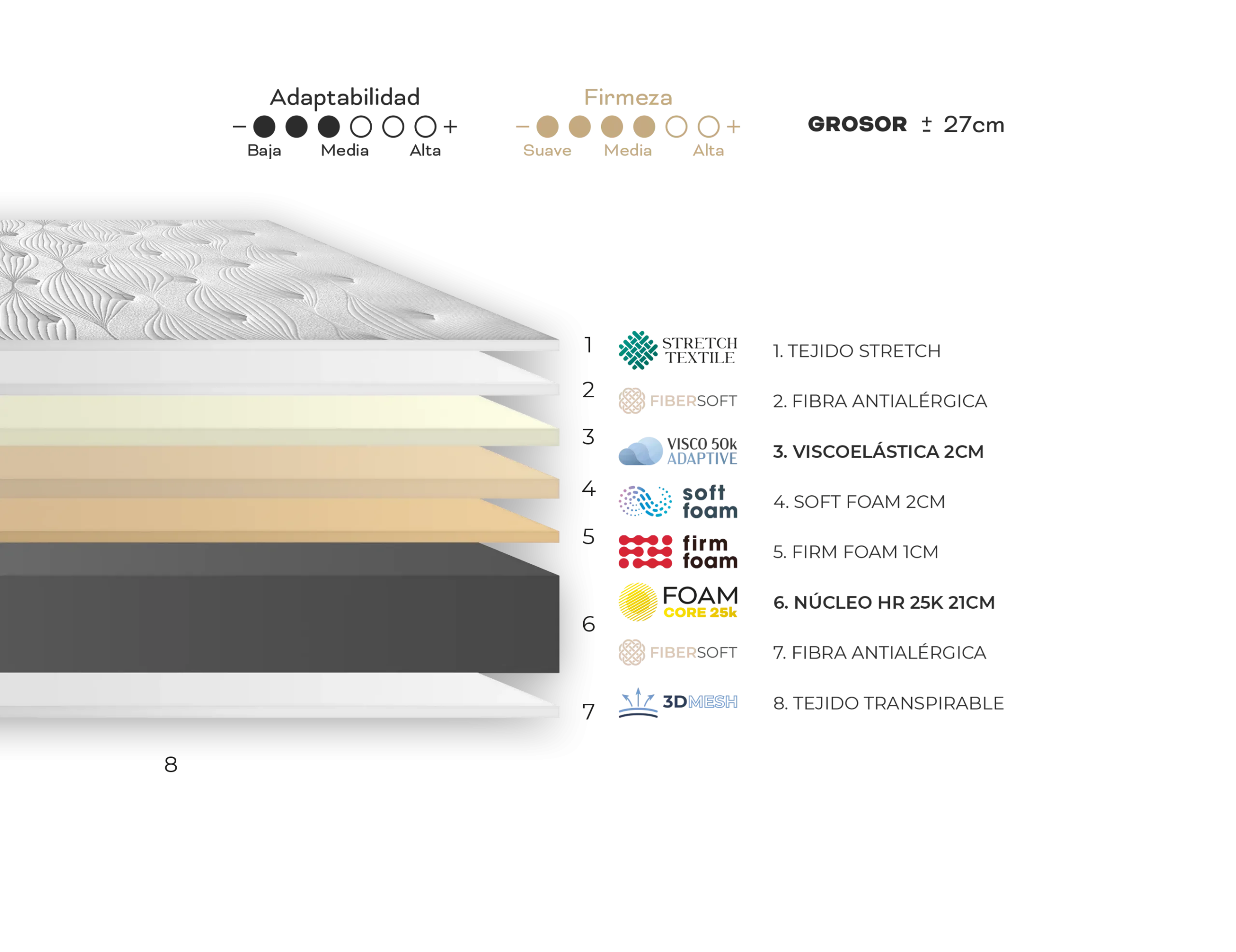 Sobre el núcleo, incorpora una composición multicapa que mejora el confort: 2 cm de viscoelástica para una mejor adaptación al cuerpo, 2 cm de Soft Foam que aportan una acogida más suave, y 1 cm de Firm Foam para mantener la estabilidad de la superficie. Estas capas se equilibran para ofrecer una sensación de firmeza media con buena adaptabilidad.