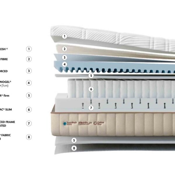 Sensación de confort profundo gracias a su generosa capa de 7 cm de viscoelástica Innogel® perfilada, aporta transpirabilidad y mejora la articulación del colchón, que se adapta con precisión a cada contorno del cuerpo. Esta acogida se equilibra con un núcleo de muelles ensacados que aporta estabilidad, ventilación y una excelente independencia de lechos. El marco perimetral de espuma HR perfilada permite que el colchón se articule con suavidad, y el tejido stretch con hilo frío. Un colchón articulable, ergonómico y diseñado para ofrecer confort sin interrupciones.