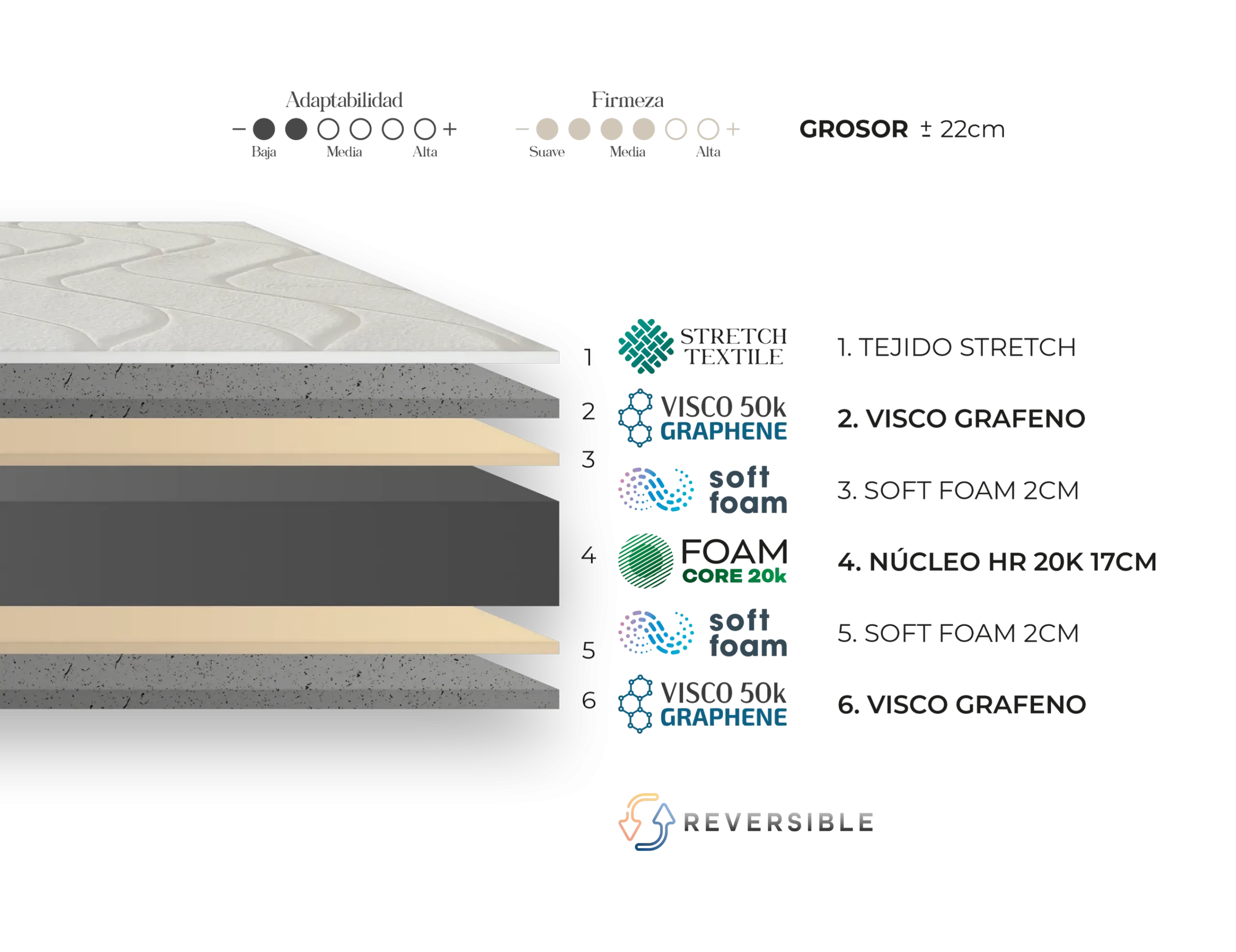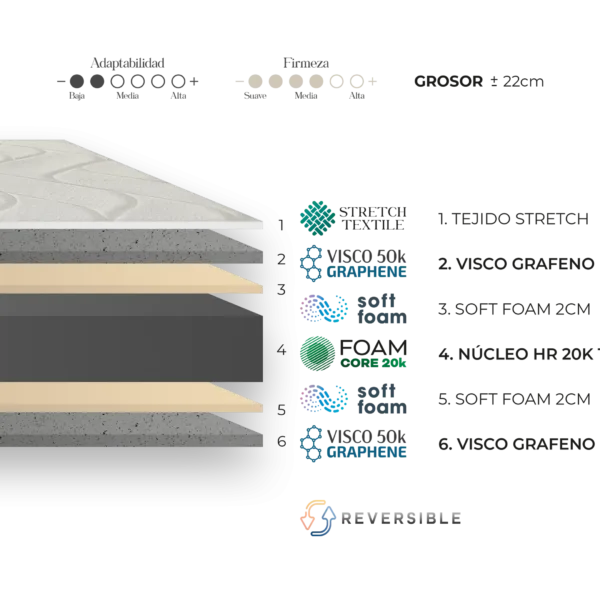 Su diseño reversible permite utilizar el colchón por ambos lados, lo cual contribuye a prolongar su durabilidad y a mantener sus propiedades de confort a lo largo del tiempo.