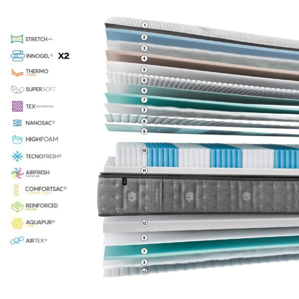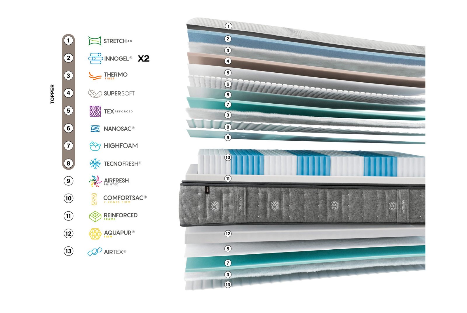 Spring Top 7Z integra el sistema Revertop®, que permite cambiar de sensaciones y ventilar el colchón al girar el topper. En verano, el tejido Tecnofresh® aporta frescor, mientras que la cara Stretch 4D ofrece suavidad y calidez en invierno. A diferencia del modelo Dual, su núcleo ComfortSac® 7Z Firm con siete zonas diferenciadas aporta sujeción específica en cada parte del cuerpo, asegurando una correcta alineación de la columna y un descanso, estable, firme y progresivo.