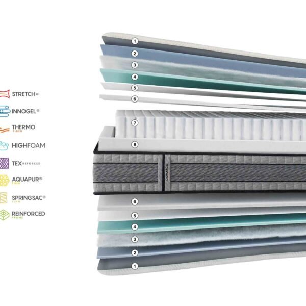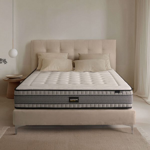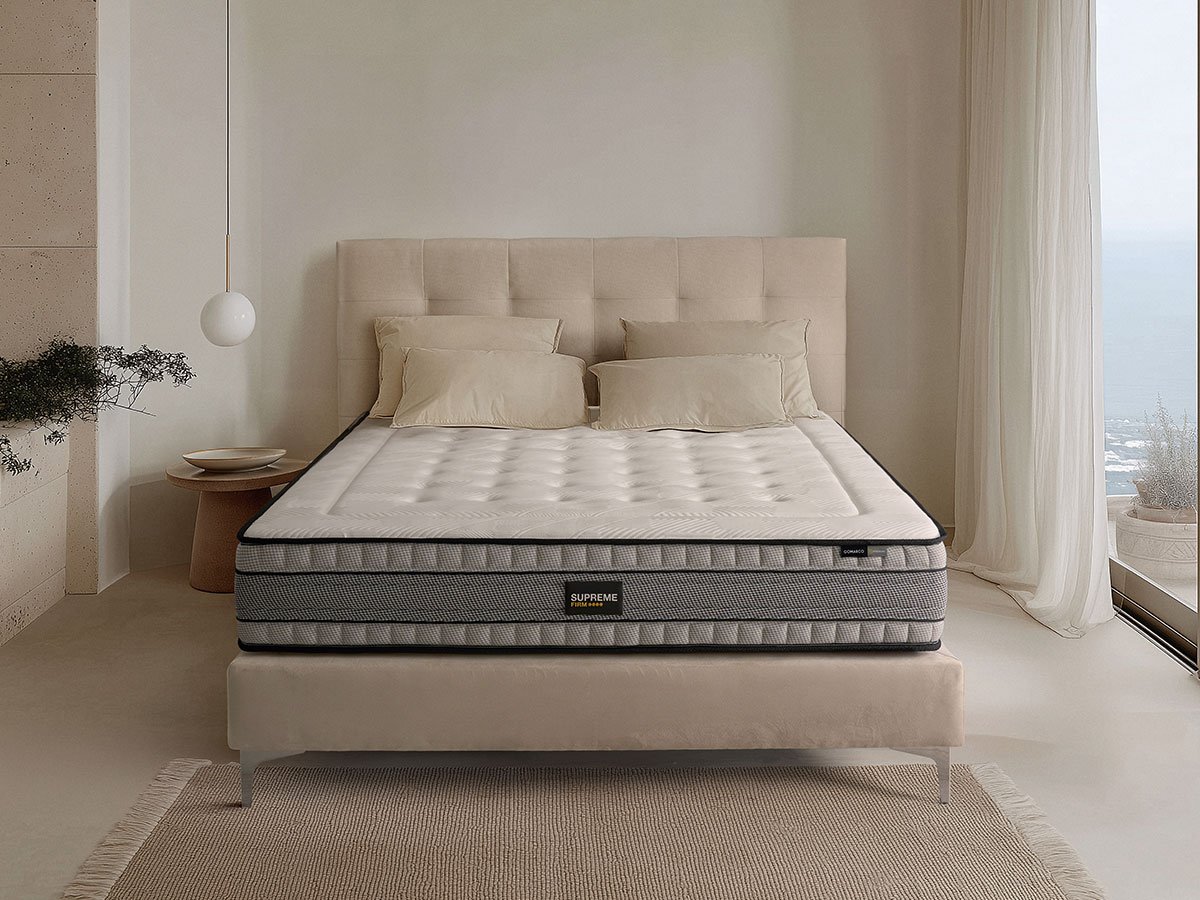 El colchón Supreme Firm está diseñado para quienes buscan un descanso firme, estable y fresco. Incorpora muelles ensacados SpringSac® Firm que garantizan una correcta alineación de la espalda y soporte duradero, junto con capas de Innogel® a doble cara que aportan frescura y confort térmico durante toda la noche. Su estructura con HighFoam, Thermo Fiber y Aquapur® optimiza la transpirabilidad, adaptabilidad y resistencia, ofreciendo un descanso profundo, equilibrado y de alta calidad.