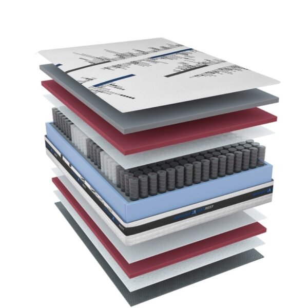 El colchón Max Rest está diseñado para quienes buscan un descanso premium con la última tecnología. Incorpora 800 muelles ensacados que proporcionan independencia de lechos y soporte punto por punto, combinados con viscografeno, que mejora la conductividad térmica y la adaptabilidad. Con una altura de 30 cm, ofrece un equilibrio perfecto entre firmeza, confort y transpirabilidad.