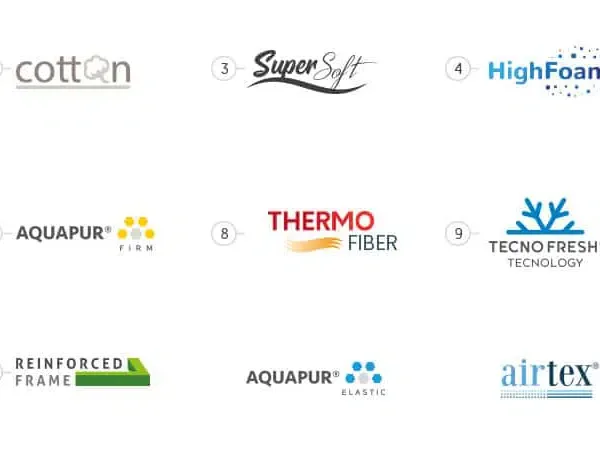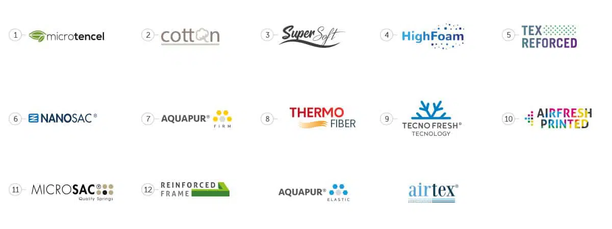 | Caracteristicas | AirFresh Printed, Airtex, CottonFiber, High Foam, NanoSAC, Reinforced Frame, Rever Top, SuperSoft, TecnoFresh, Tex Reforced, ThermoFiber |