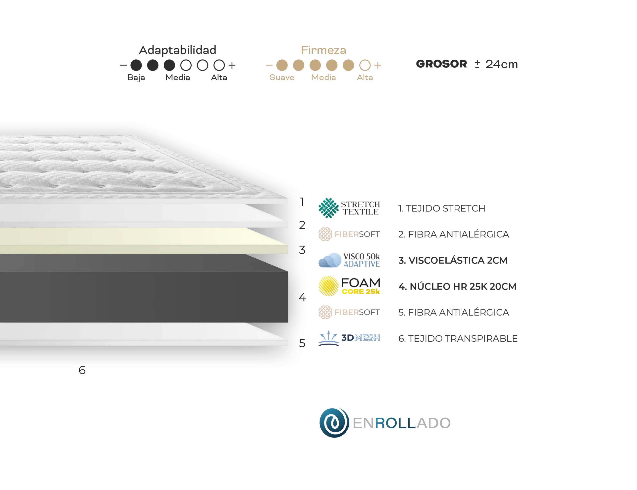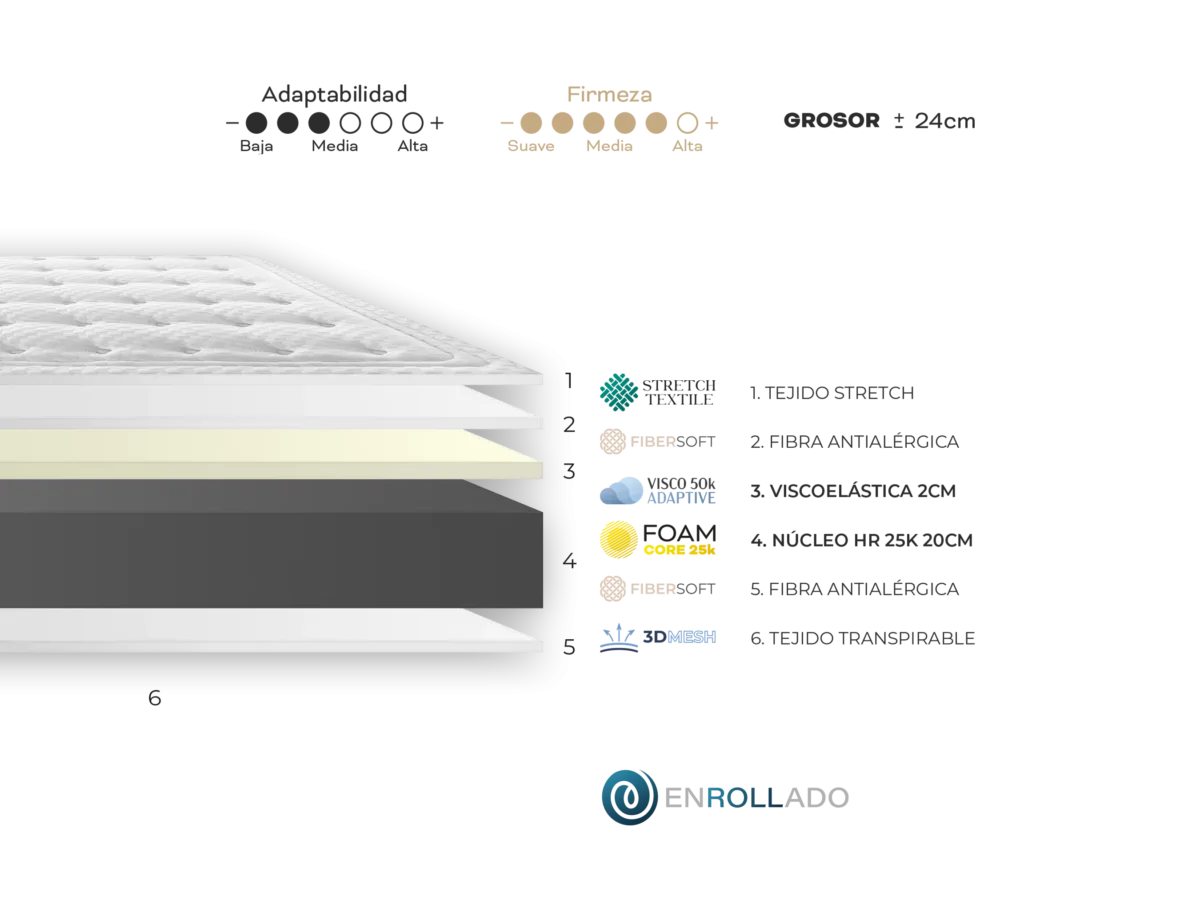 En la cara superior incorpora una capa de viscoelástica de 2 cm que mejora la adaptación al cuerpo, reduciendo los puntos de presión. Ambas caras están acolchadas con fibra antialérgica, lo que aporta suavidad, transpirabilidad y mayor higiene.