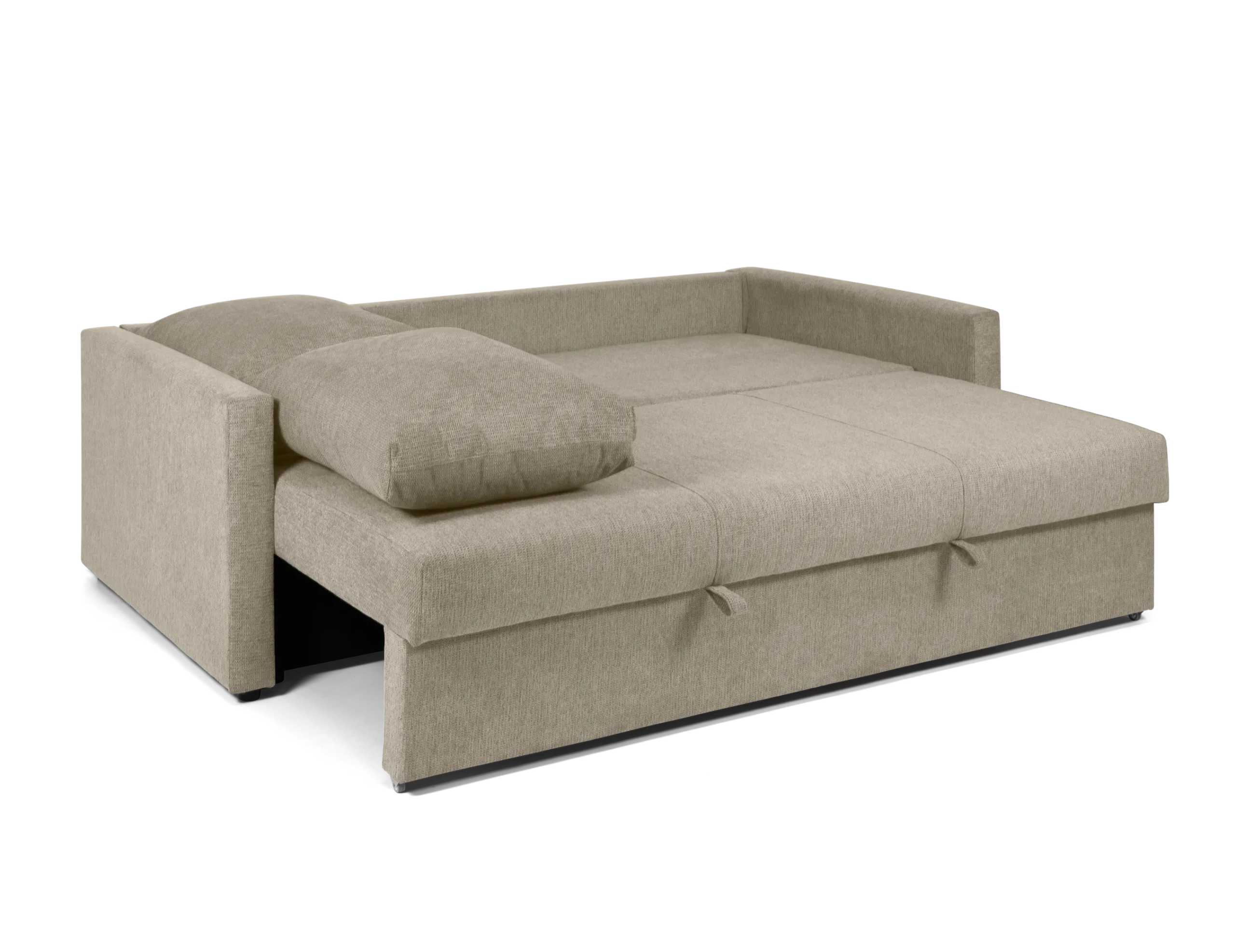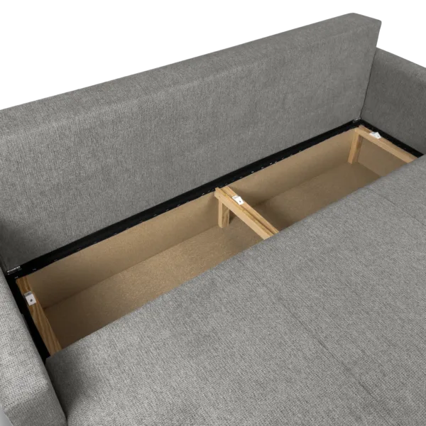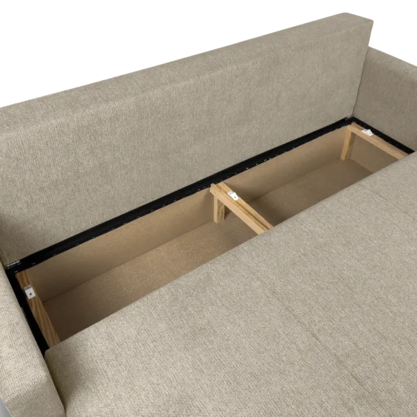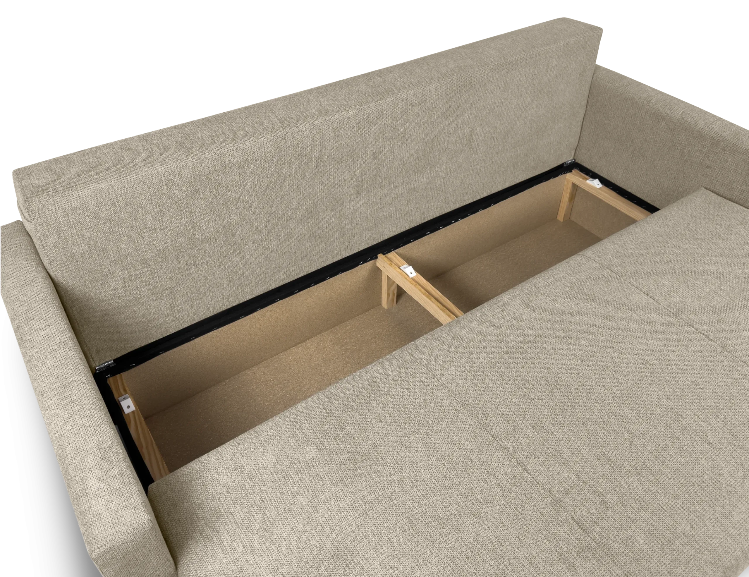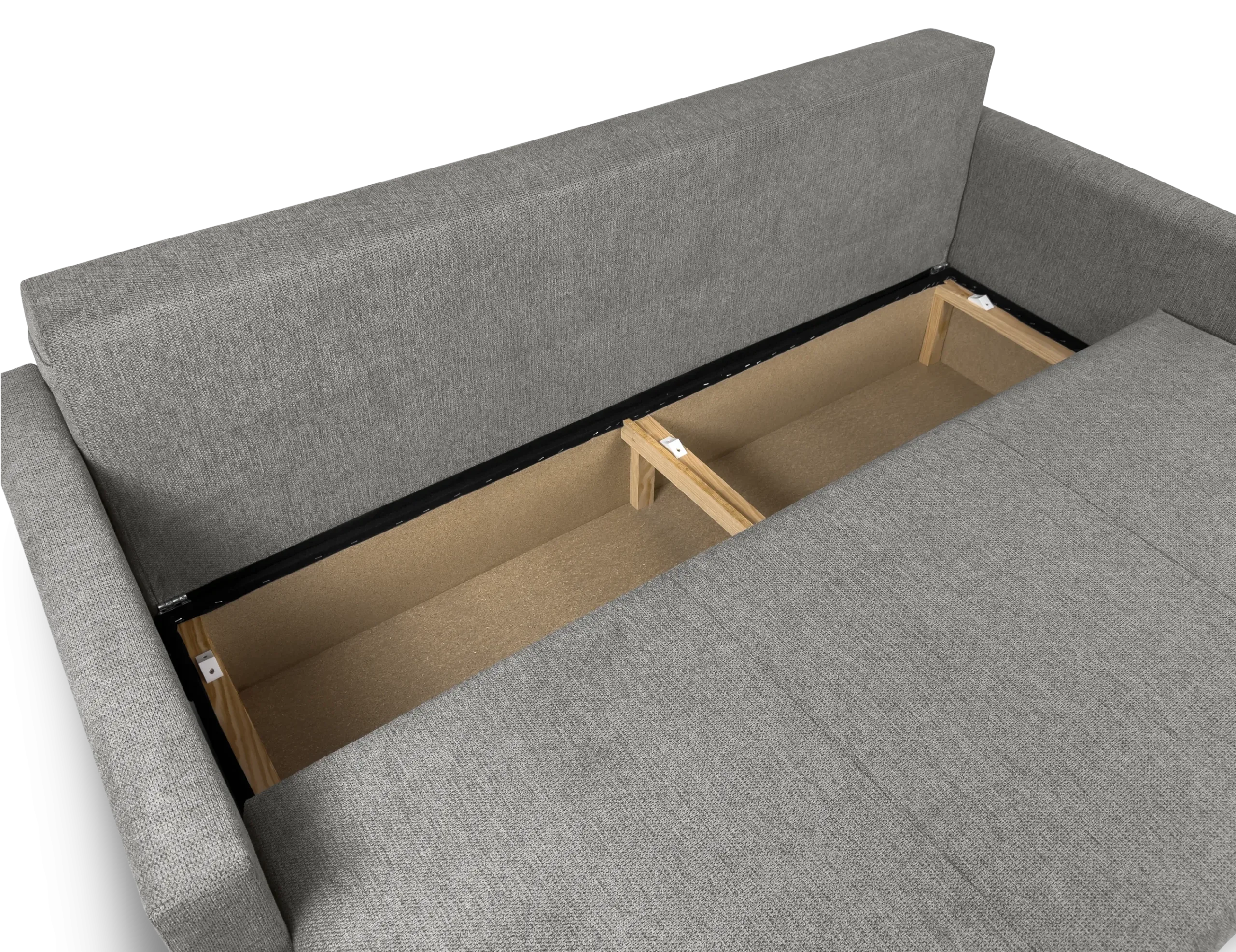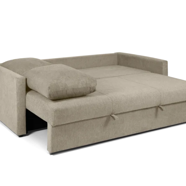 El sistema de apertura tipo nido se acciona mediante dos tiradores frontales que deslizan el asiento revelando su arcón interior. A continuación, el respaldo se pliega hacia adelante para cerrar el arcón y completar una amplia superficie de cama.