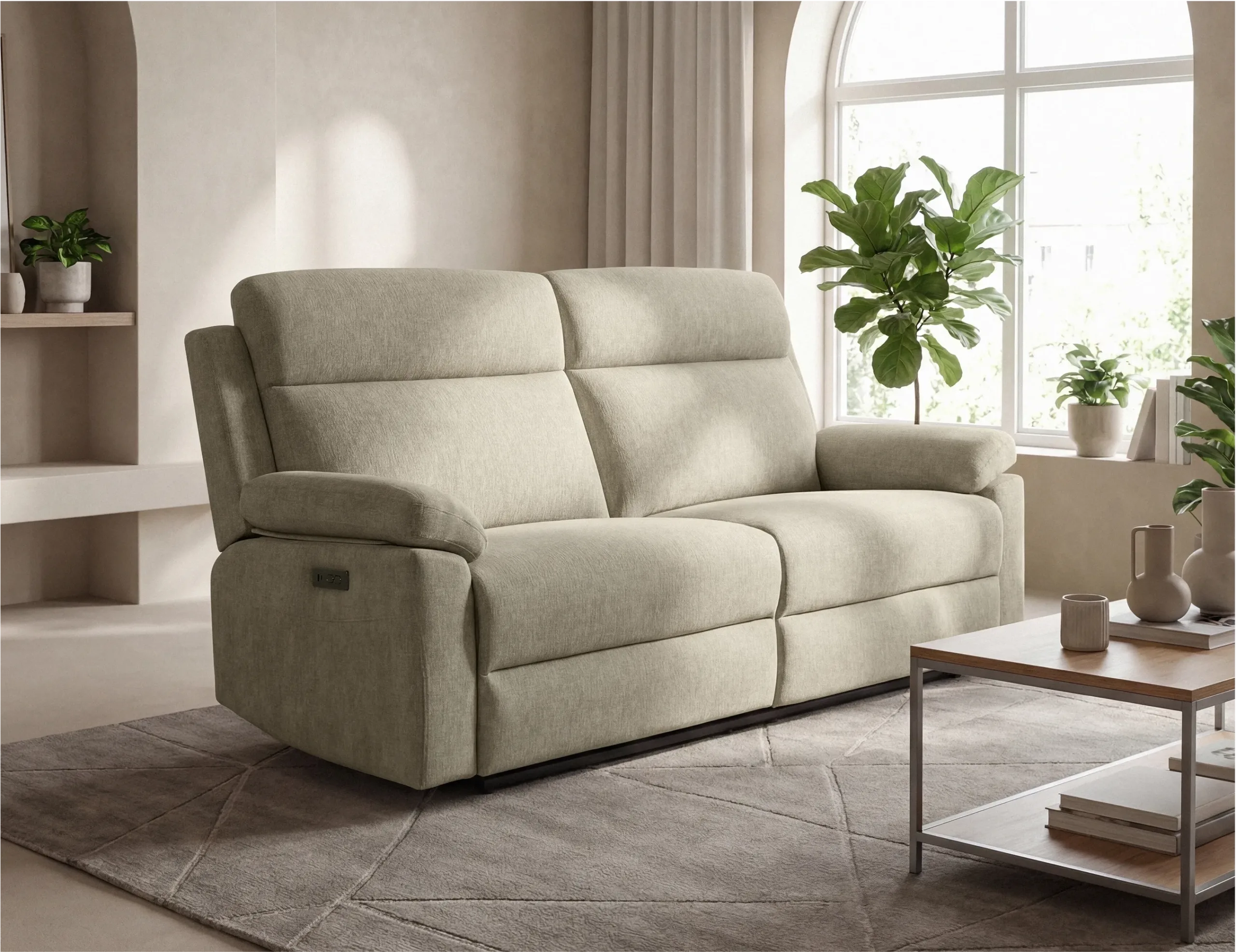 El sofá Brujas está diseñado para proporcionar comodidad en cualquier entorno. Equipado con dos relax eléctricos que permiten el ajuste del respaldo y el reposapiés de manera simultánea en cada asiento. Fabricado con estructura de madera y contrachapado, tapizado en tela Bjorn antimanchas, y asientos HR de 28kg con muelles ensacados, garantiza confort y durabilidad. Incluye USB para cargar dispositivos. Resistencia máxima de 130kg.