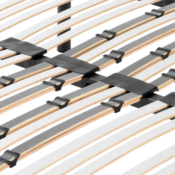 El somier Euro 11 es una base resistente que incorpora un tubo acerado de 40x30mm y láminas de haya de 12cm curvadas para mayor durabilidad. Su acabado en papel grafito aporta un toque moderno. Los tacos superiores de polietileno HQ aseguran estabilidad, y cuenta con barra central de refuerzo a partir de 135 cm, aumentando la firmeza en medidas amplias.