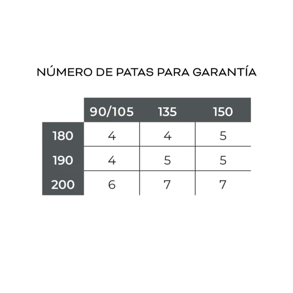 | Patas | 6 Patas de Madera Blanca 25 cm, 6 Patas de Madera Natural 25 cm, 6 Patas de Madera Wengue 25 cm, 6 Patas de Metal Grafito 25 cm, 7 Patas de Madera Blanca 25 cm, 7 Patas de Madera Natural 25 cm, 7 Patas de Madera Wengue 25 cm, 7 Patas de Metal Grafito 25 cm, Sin Patas |