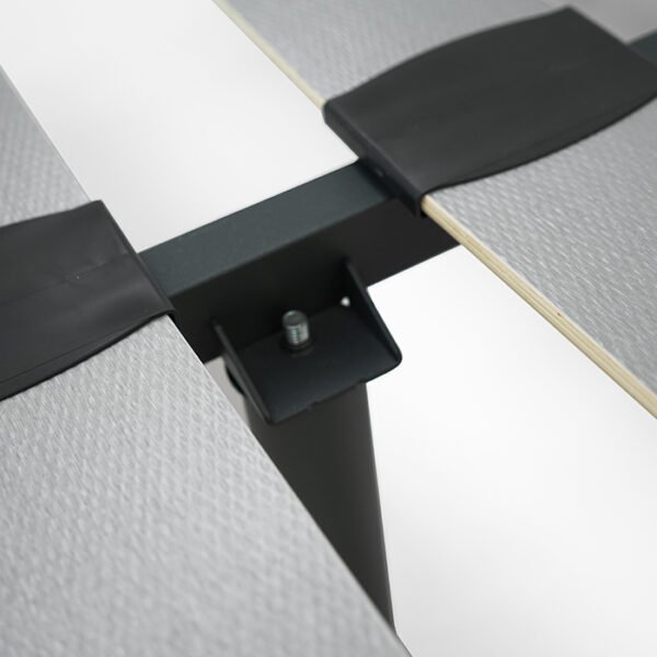 láminas curvas de 120mm, en madera de haya con revestimiento en grafito texturado con sistema de sujeción de taco superpuesto en PVC para reducción de ruido. Barra central de refuerzo a partir de 100cm de ancho.